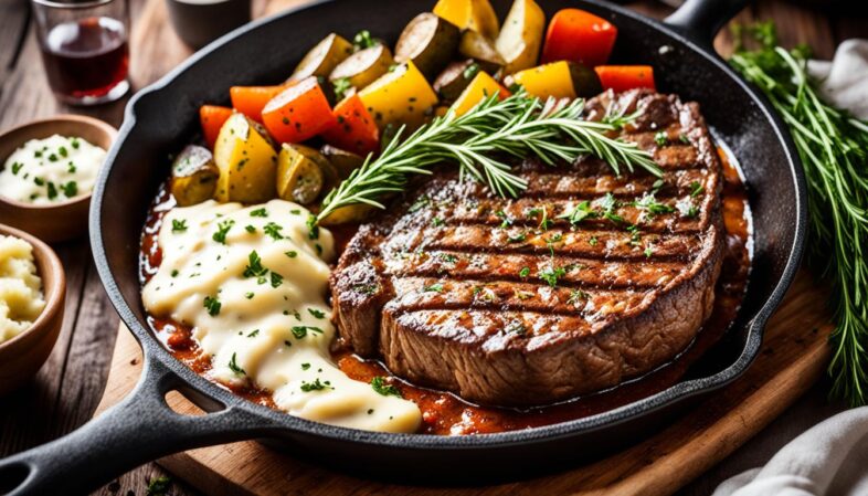 A well-seasoned cast iron skillet also means the steak releases cleanly when it’s time to flip, which matters for the crust. Poorly seasoned pan, steak tears, crust goes with it.